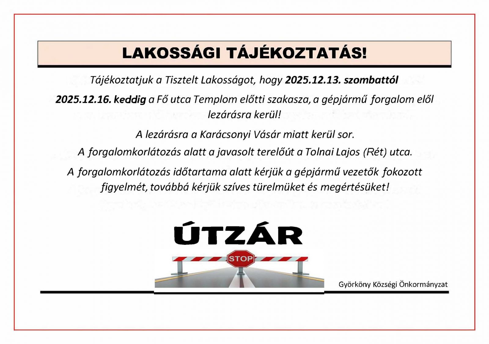 Lakossági tájékoztatás útlezárásról